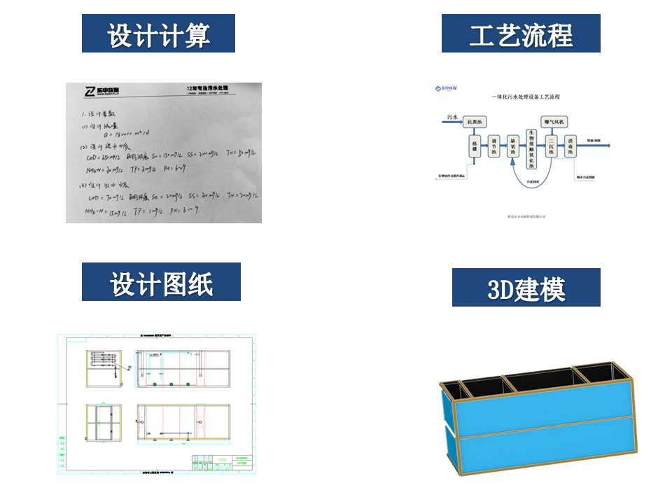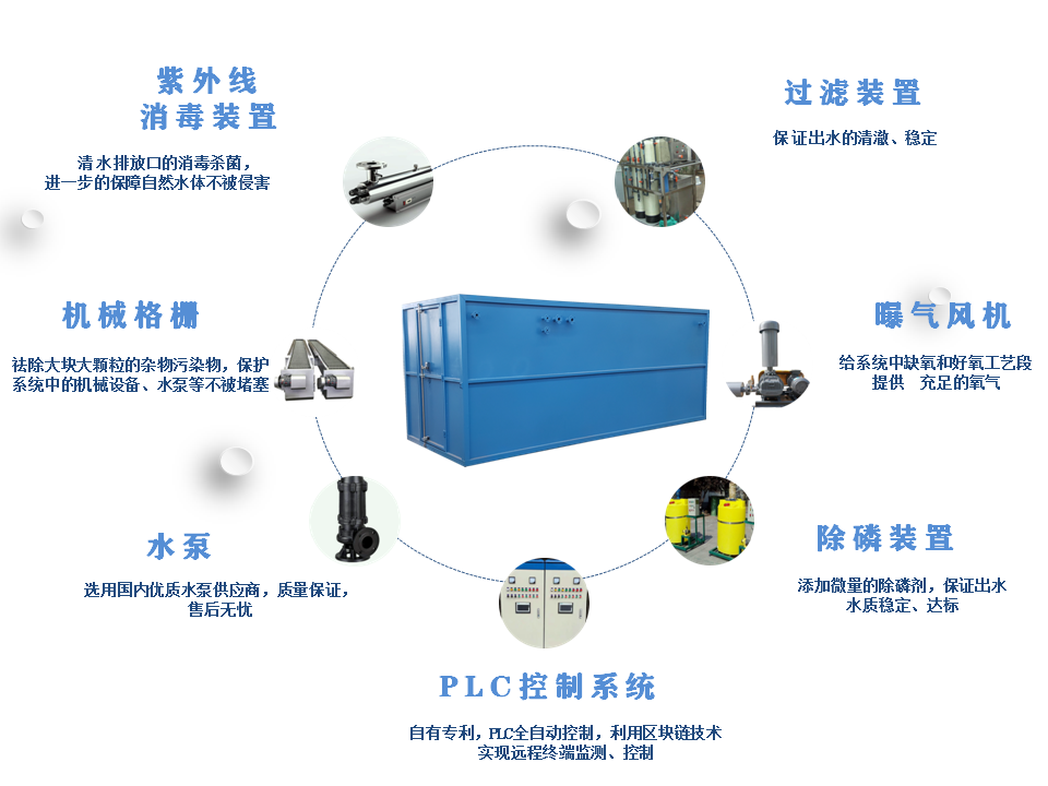 LeptechR 一體化污水處理設備由格柵、缺氧池、生物接觸氧化池、二沉池、污泥池、消毒池、鼓風機等配套設備組合而成。