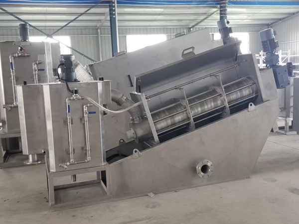 設備前端為濃縮段,后端為脫水段。污泥在濃縮段經重力脫水后,被運輸?shù)矫撍危谇斑M過程中隨著慮縫及螺距的逐漸變小,以及背壓板的作用下,產生極大的內壓,容積不斷縮小,達到充分脫水的目的,